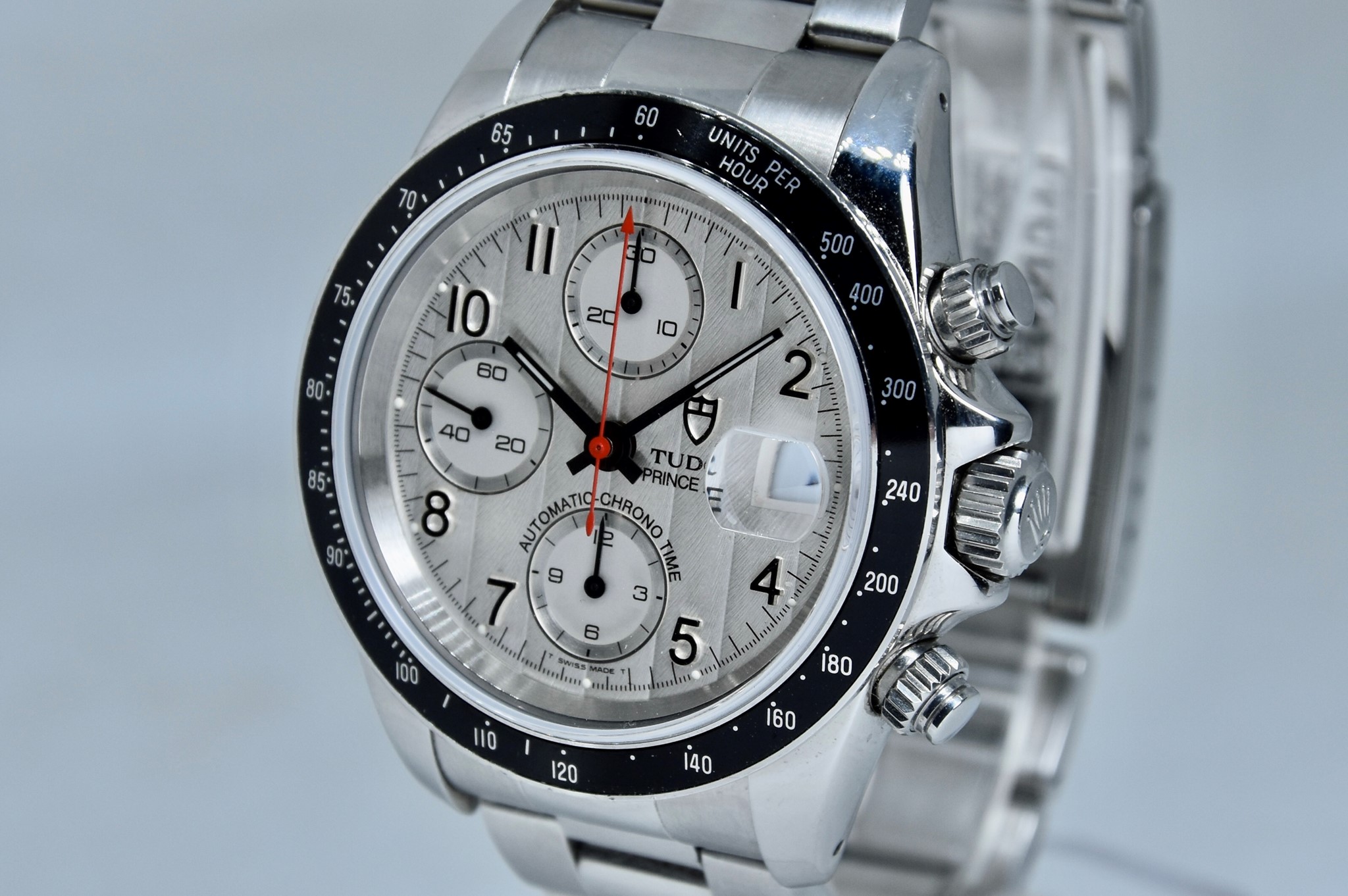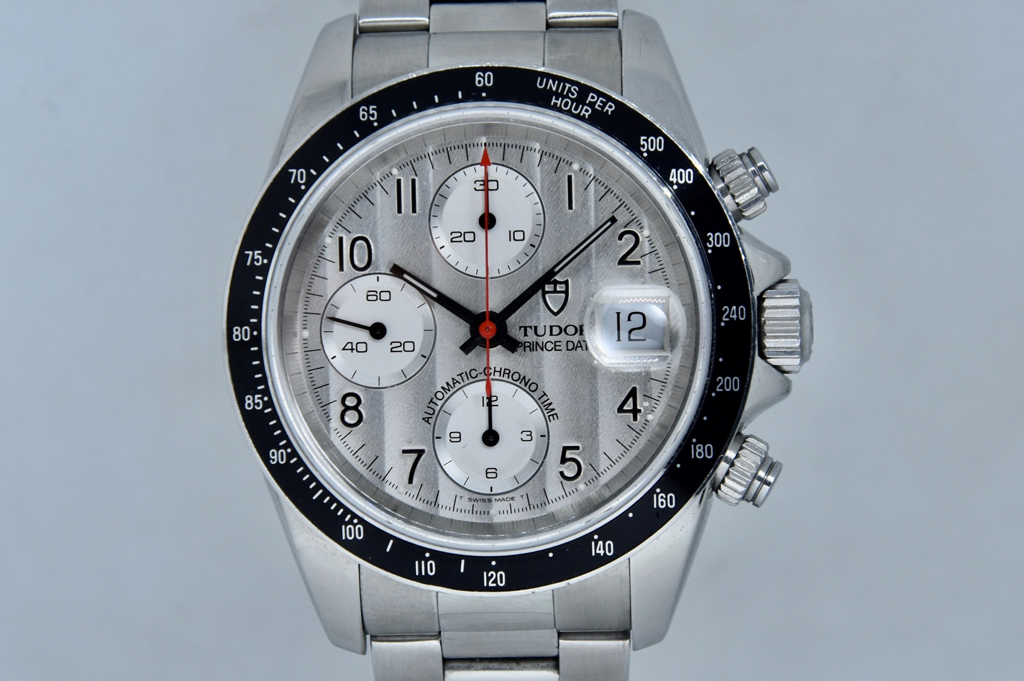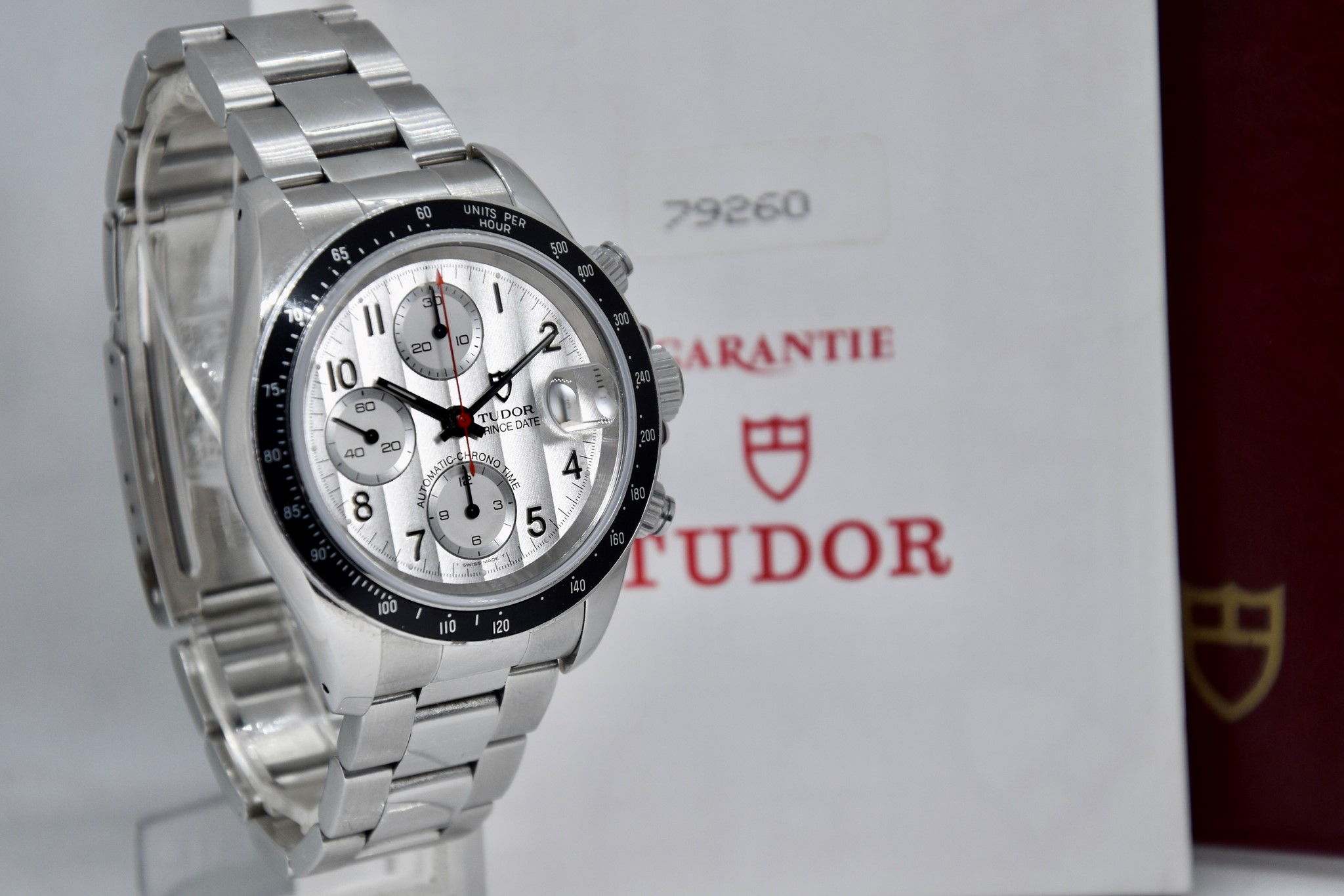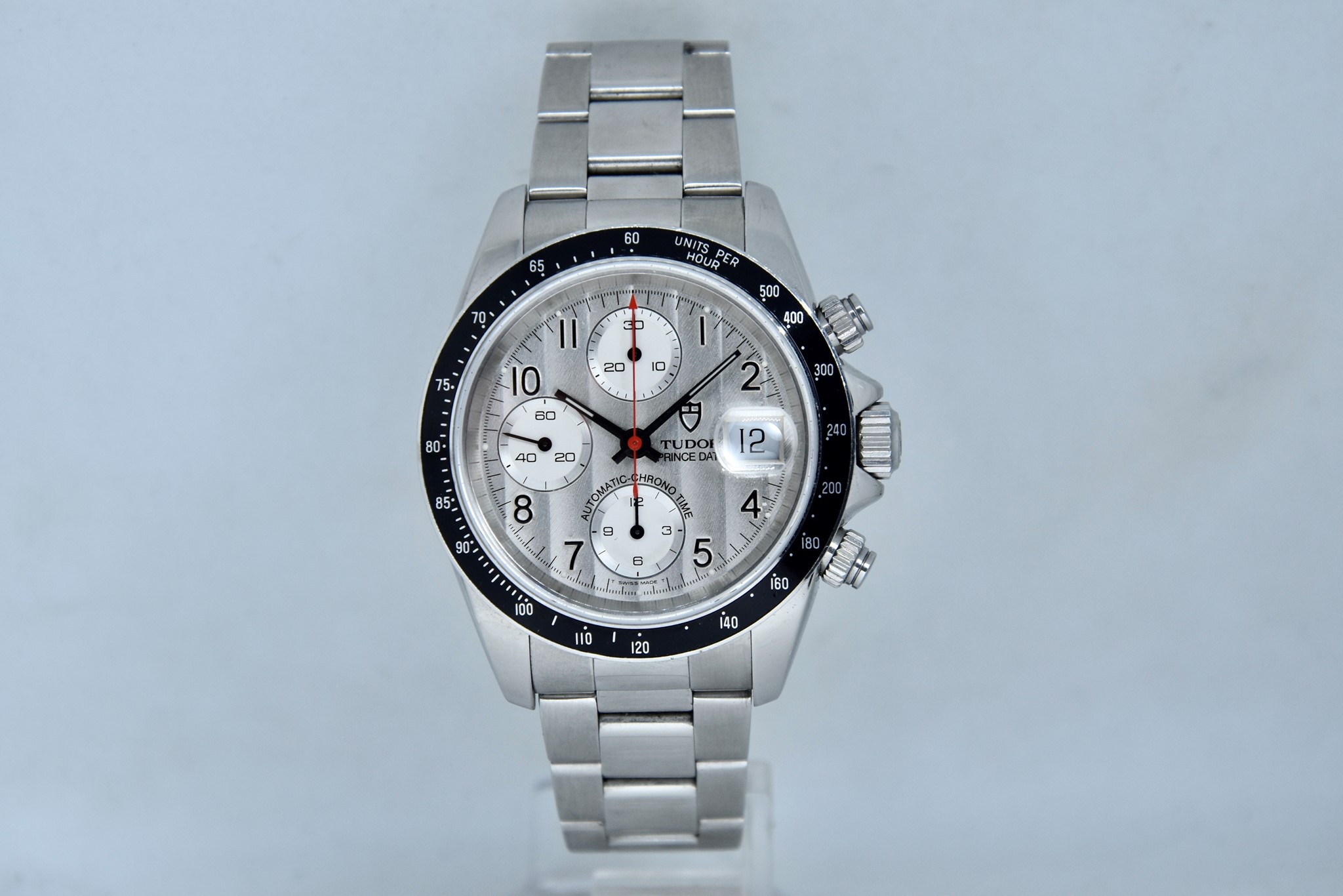 Tudor Prince Date ref. 79260 del 1998. Orologio in acciaio in ottime condizioni. Quadrante grigio con numeri arabi. Contatori bianchi. Movimento a carica automatica. Ghiera con scala tachimetrica nera lucida. Diametro cassa 40mm. Vetro zaffiro. Indicatore del datario. Corona a vite originale. Bracciale in acciaio oyster originale. Presente anche il cinturino originale con deployante. Indici e lancette al trizio. Con scatola e garanzia originali.