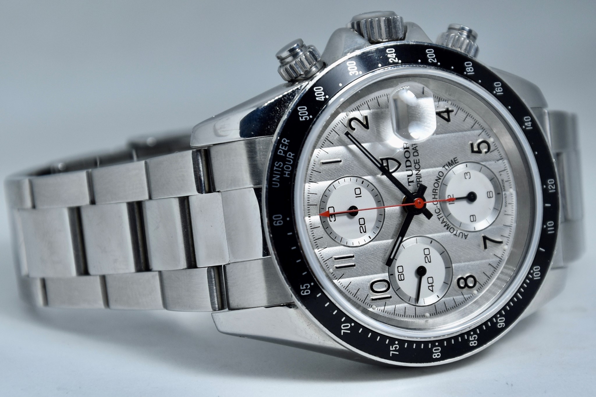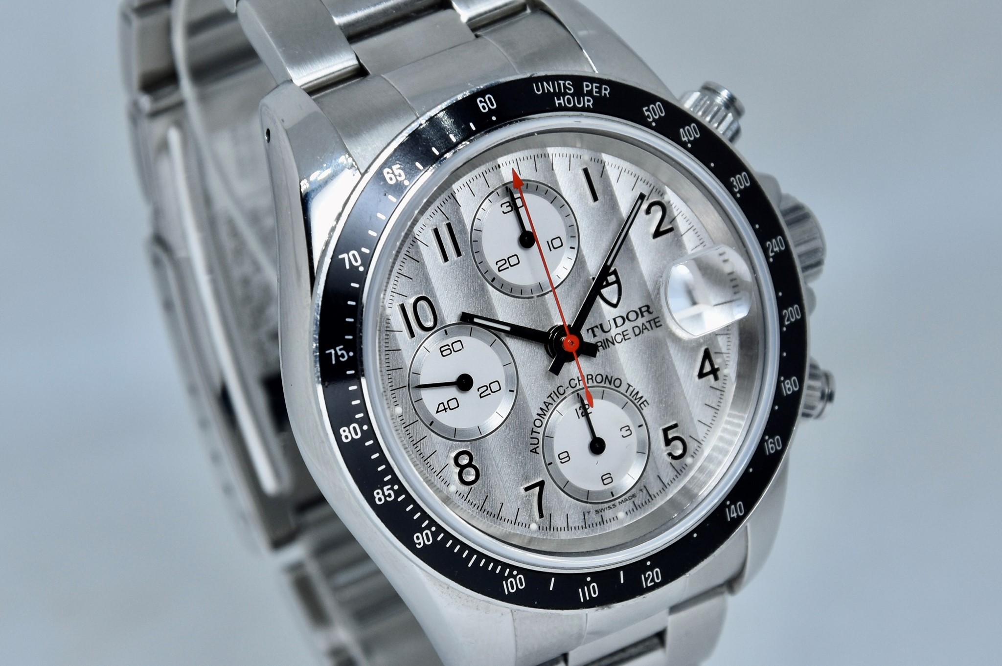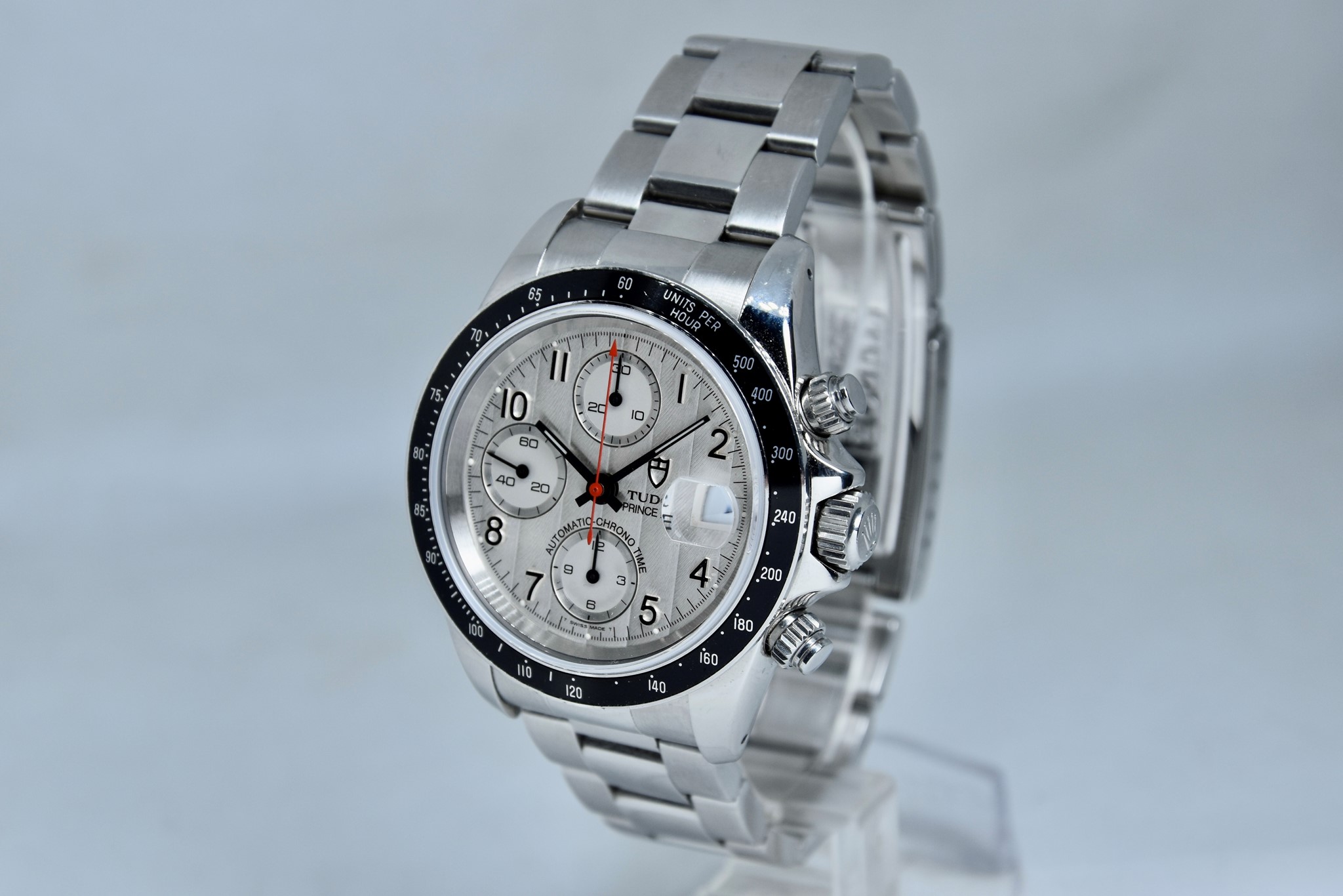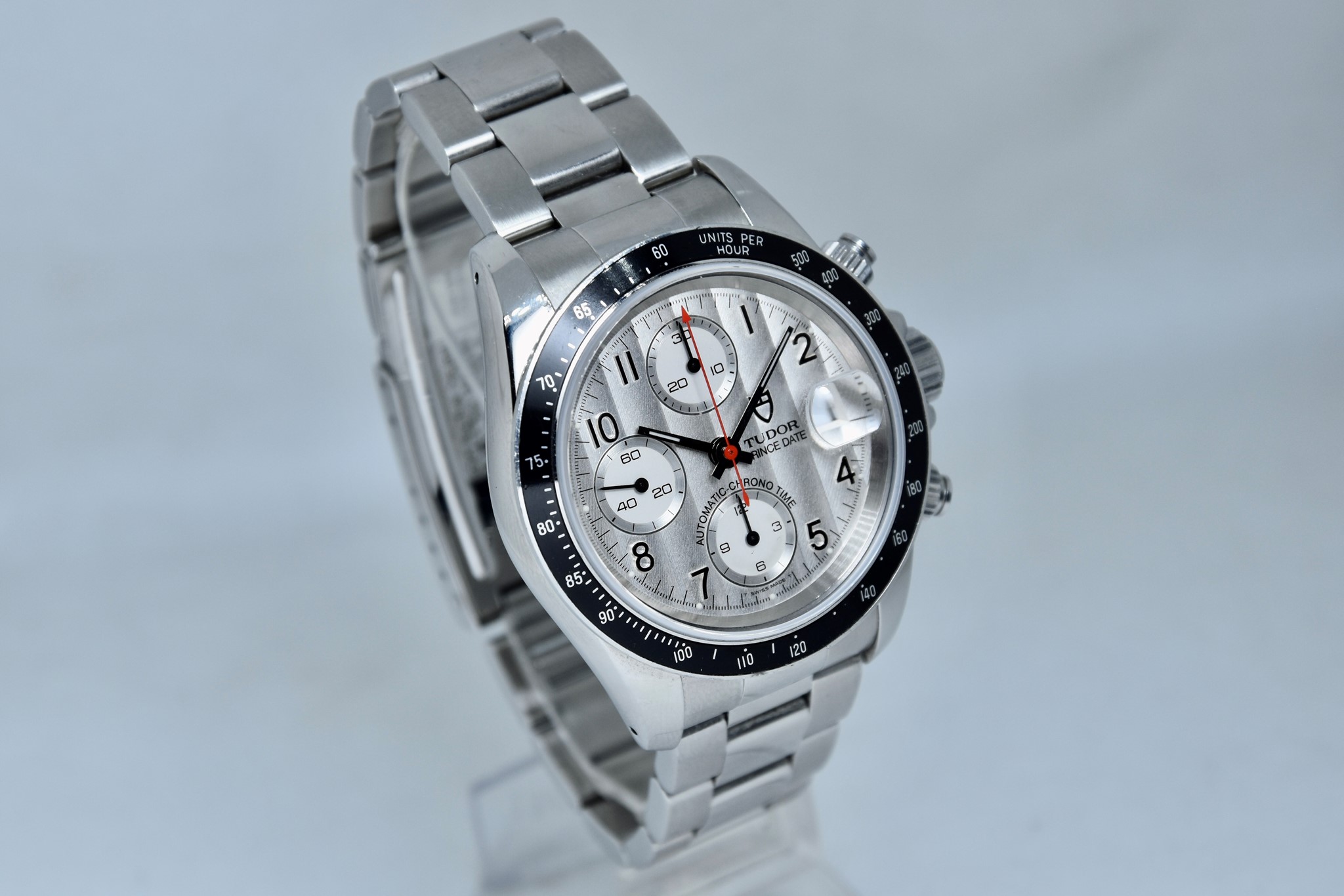 Tudor Prince Date ref. 79260 del 1998. Orologio in acciaio in ottime condizioni. Quadrante grigio con numeri arabi. Contatori bianchi. Movimento a carica automatica. Ghiera con scala tachimetrica nera lucida. Diametro cassa 40mm. Vetro zaffiro. Indicatore del datario. Corona a vite originale. Bracciale in acciaio oyster originale. Presente anche il cinturino originale con deployante. Indici e lancette al trizio. Con scatola e garanzia originali.