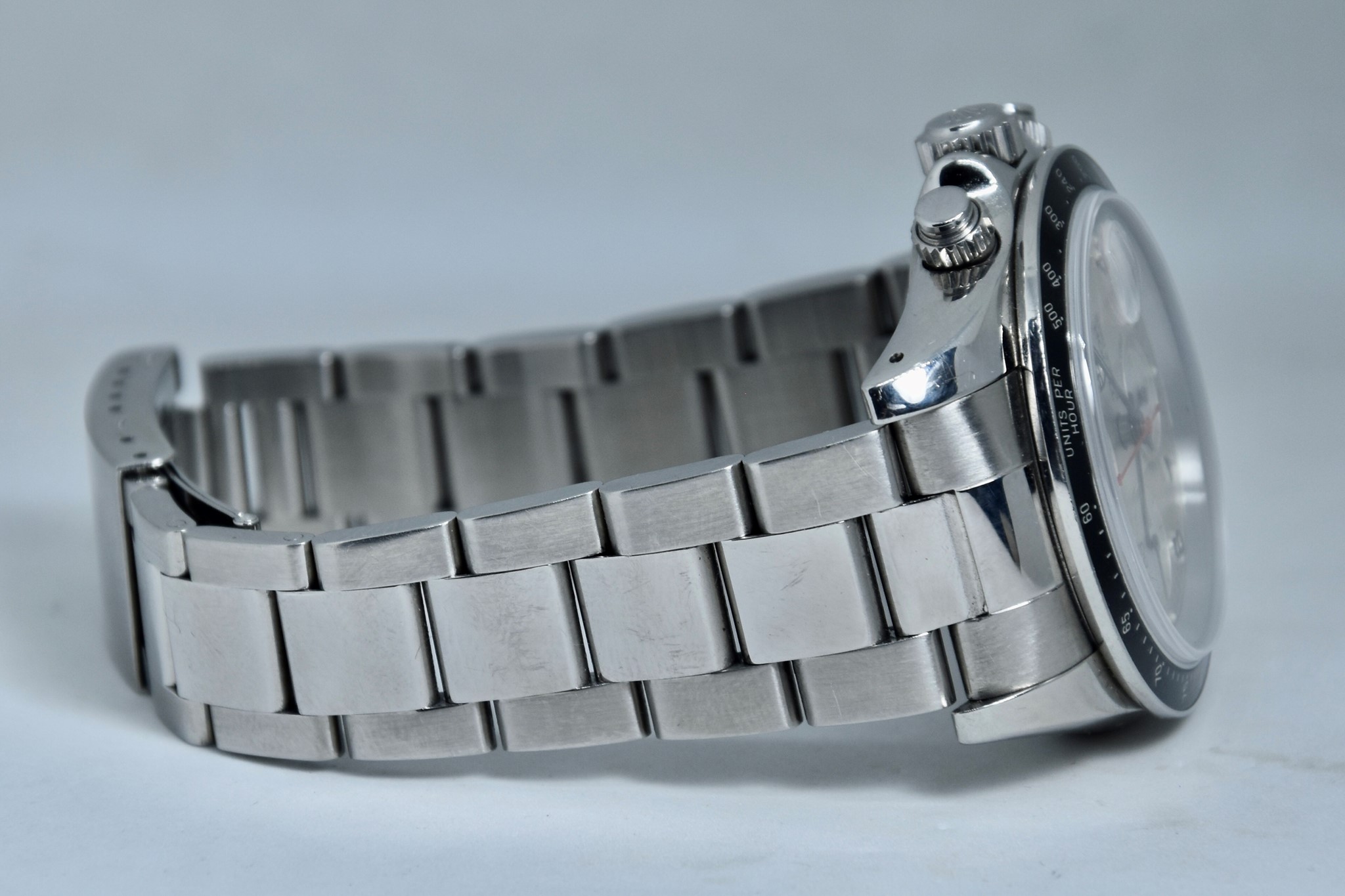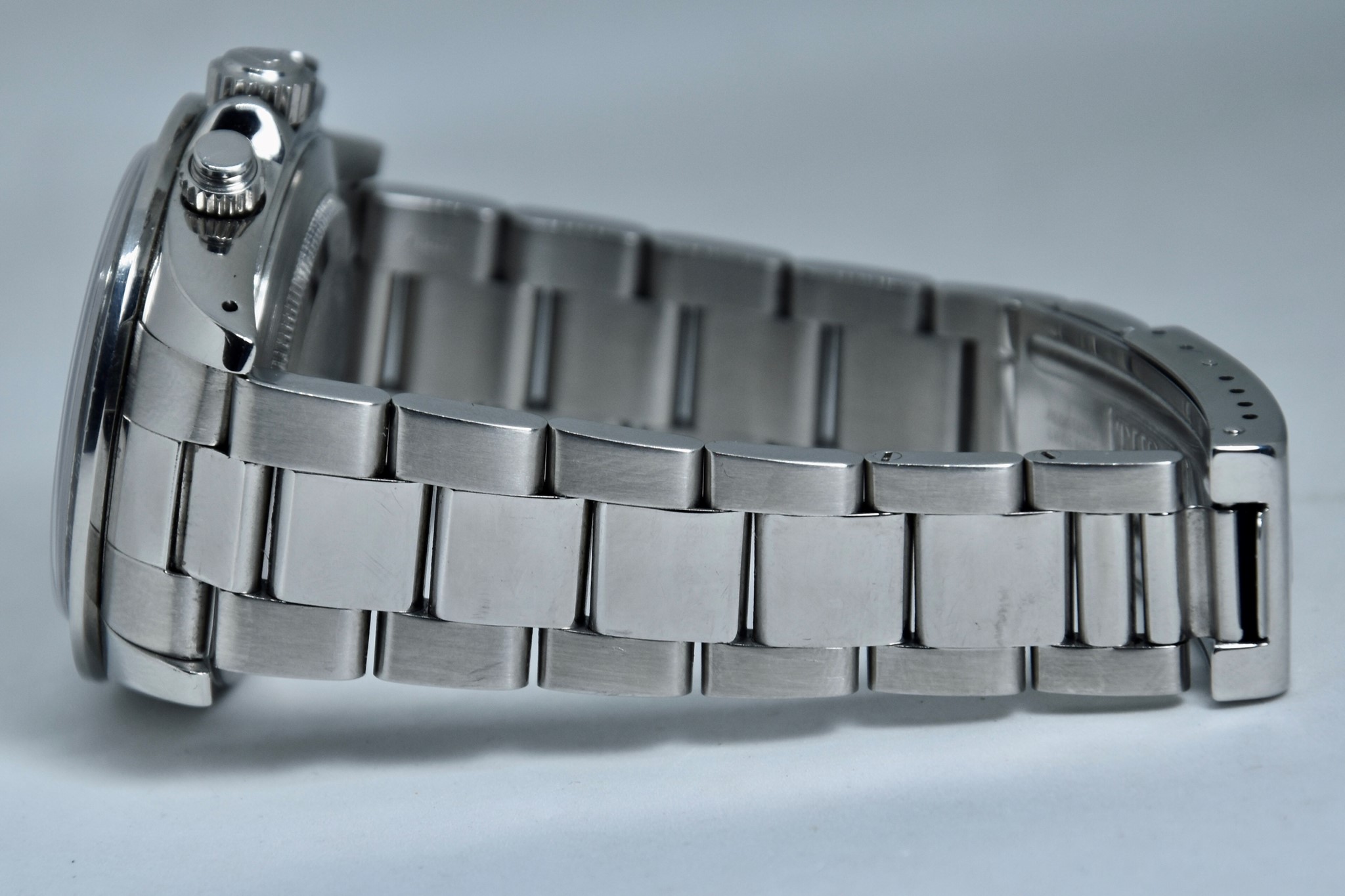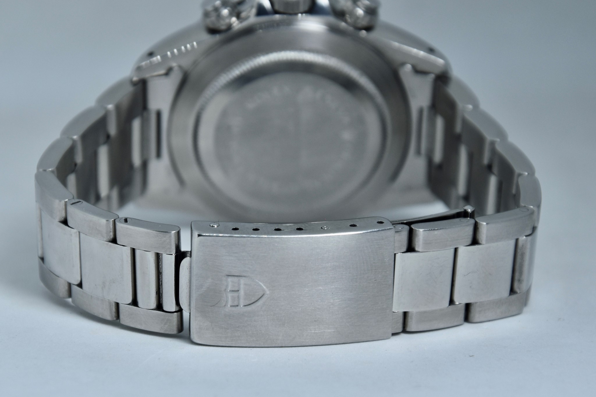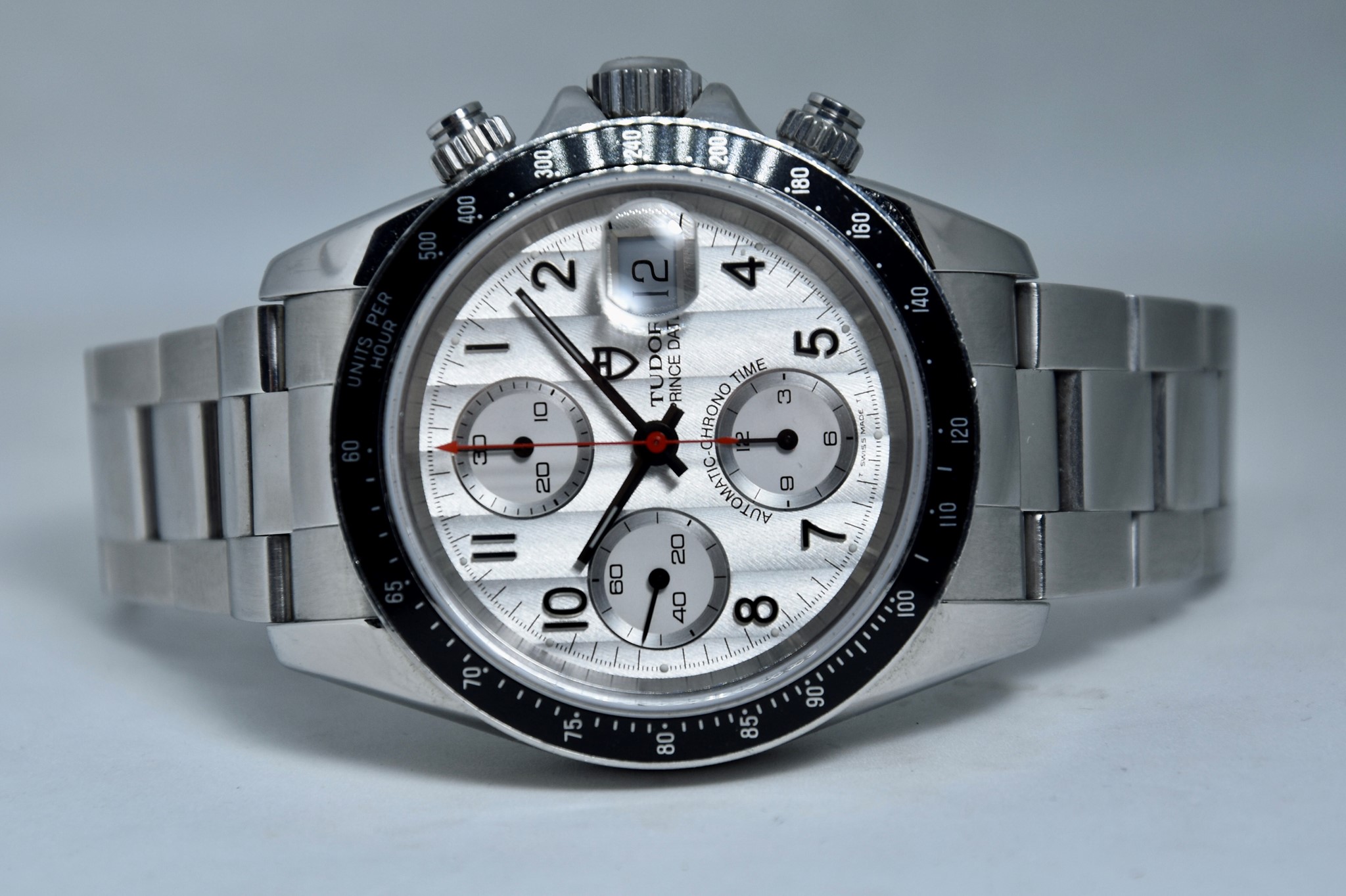 Tudor Prince Date ref. 79260 del 1998. Orologio in acciaio in ottime condizioni. Quadrante grigio con numeri arabi. Contatori bianchi. Movimento a carica automatica. Ghiera con scala tachimetrica nera lucida. Diametro cassa 40mm. Vetro zaffiro. Indicatore del datario. Corona a vite originale. Bracciale in acciaio oyster originale. Presente anche il cinturino originale con deployante. Indici e lancette al trizio. Con scatola e garanzia originali.