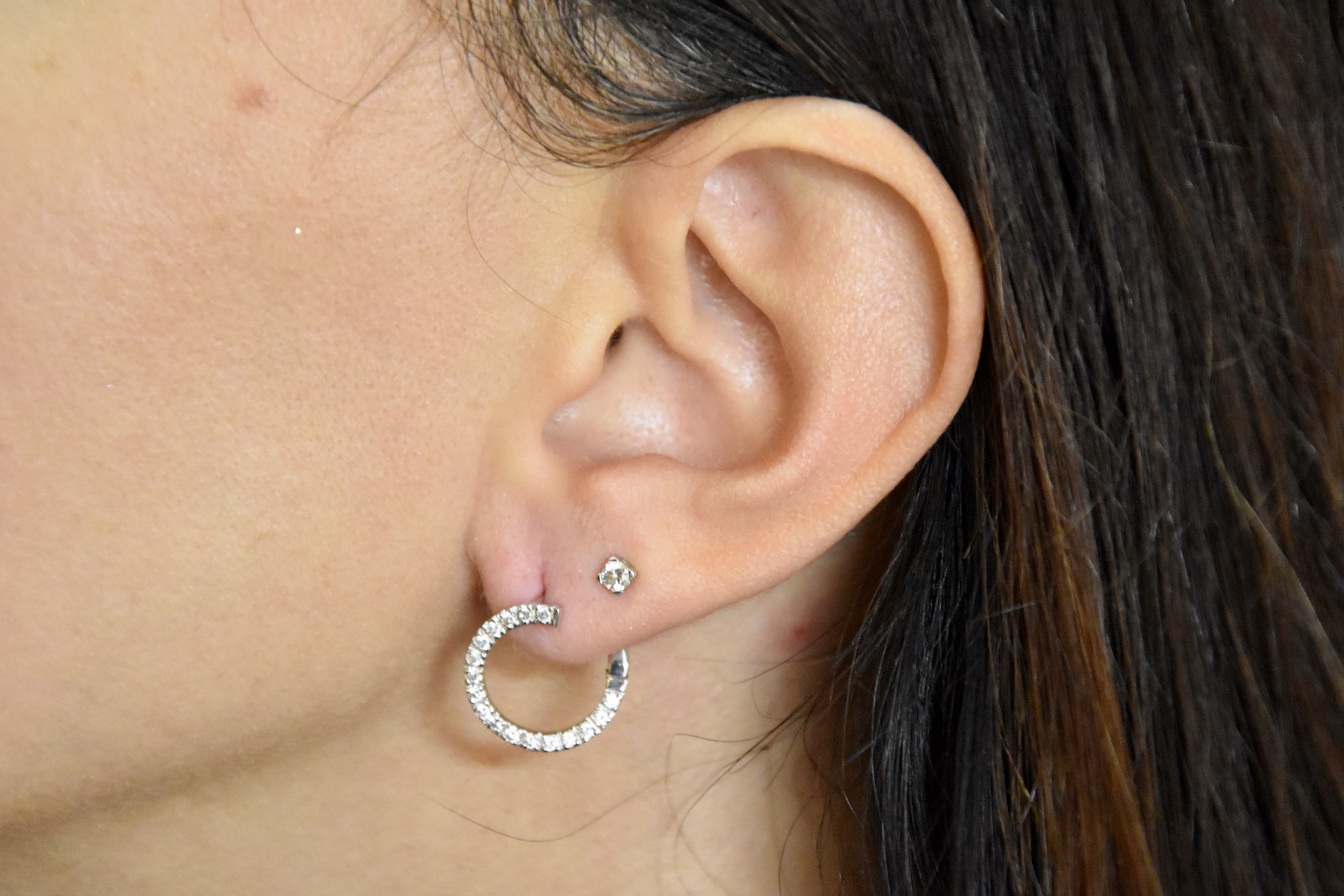 Particolari verette asimmetriche in oro bianco 750/00 con zirconi. Peso totale g. 4,20.